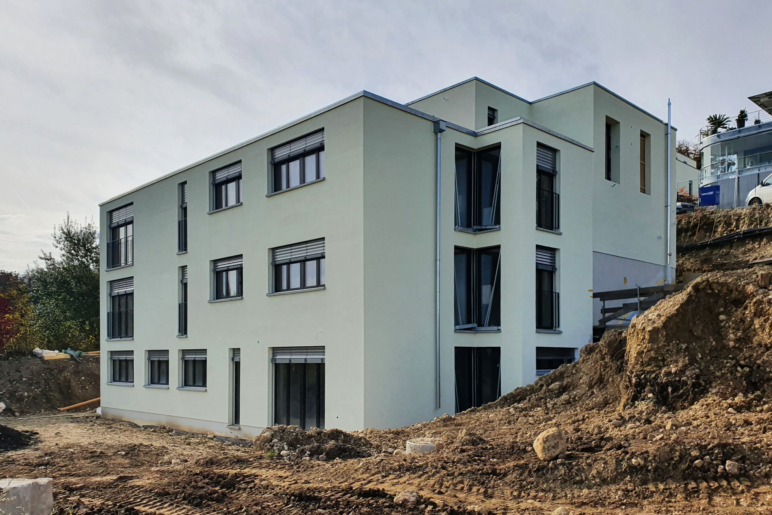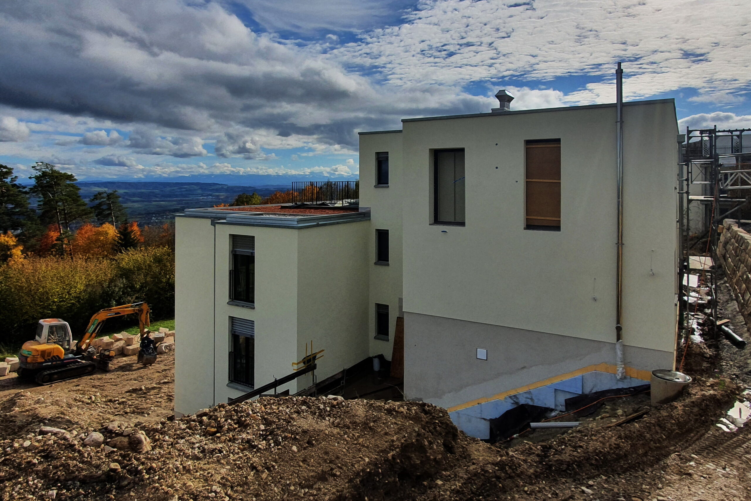 Neubau eines Mehrfamilienhauses mit fünf Wohnungen und Ausblick auf die Alpen und das Seeland.