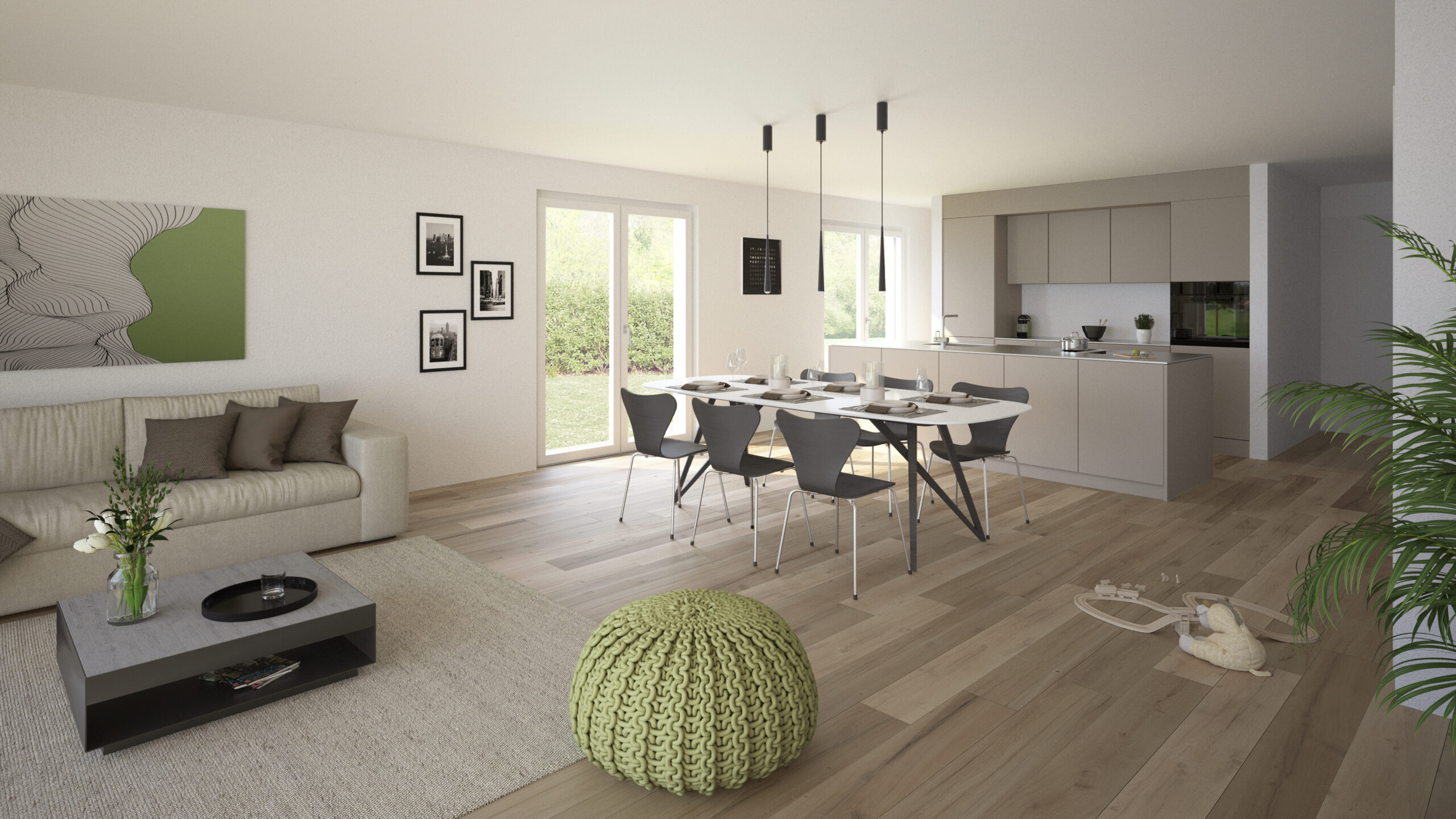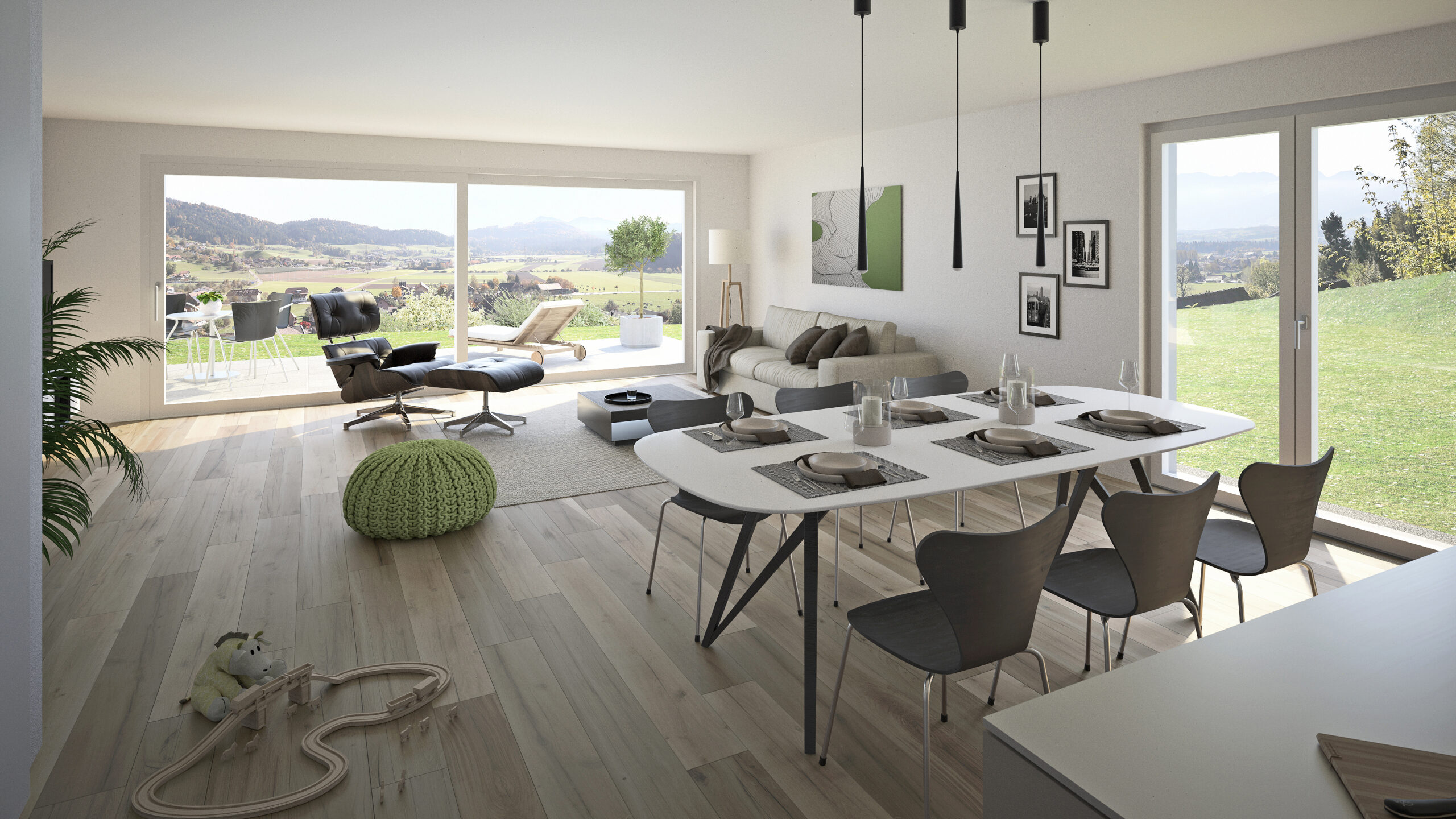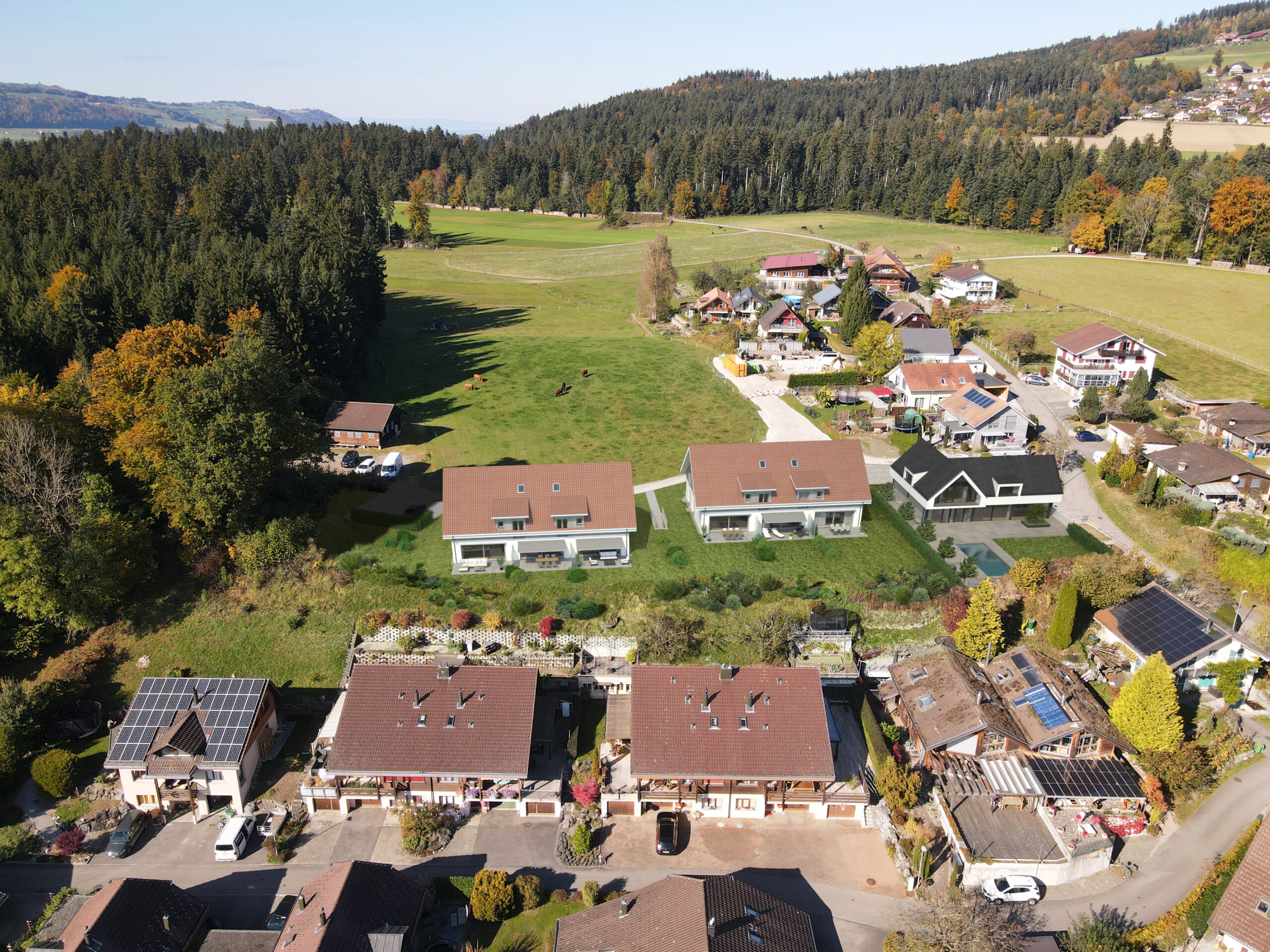 Auf der Egg in Herbligen entsehen zwei Reihenhäuser mit jeweils drei Einheiten. Die modernen Häuser verfügen im Erdgeschoss jeweils über ein grosszügiges Wohn- und Esszimmer, eine Küche mit Kochinsel, sowie ein WC und Reduit. Die gegen Süden ausgerichtete Terrasse bietet einen tollen Blick auf die Alpen. Über die Interne Treppe gelangt man ins Obergeschoss, wo sich die Schlafräume sowie die Badezimmer befinden. Im Dachgeschoss befindet sich eine offene Galerie. Jede Einheit verfügt im Untergeschoss über grosse Nebenräume (Keller, Waschen, Technik). Vom Untergeschoss hat man einen direkten Zugang in die Einstellhalle mit 12 Parkplätzen und in den Fahrradraum.