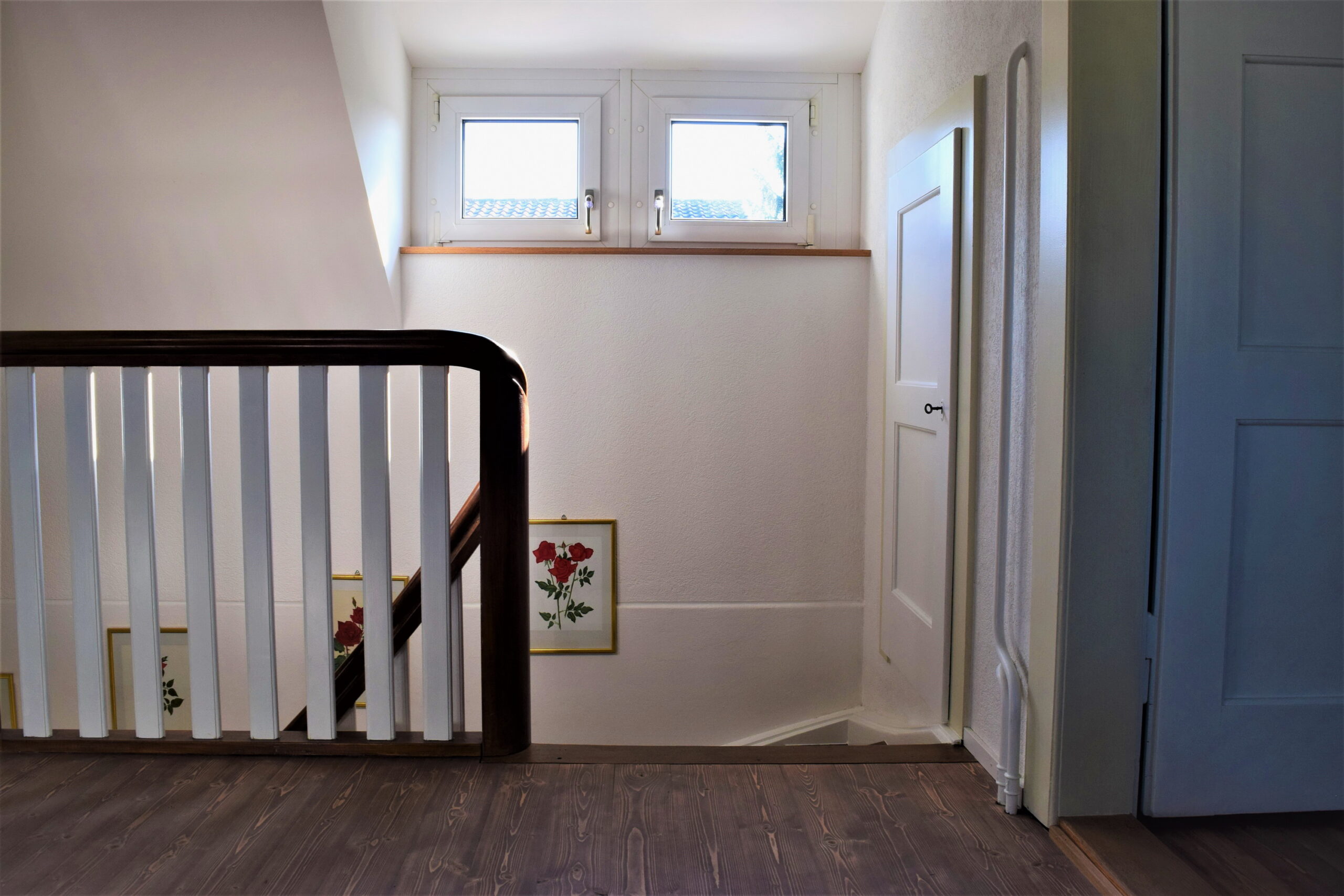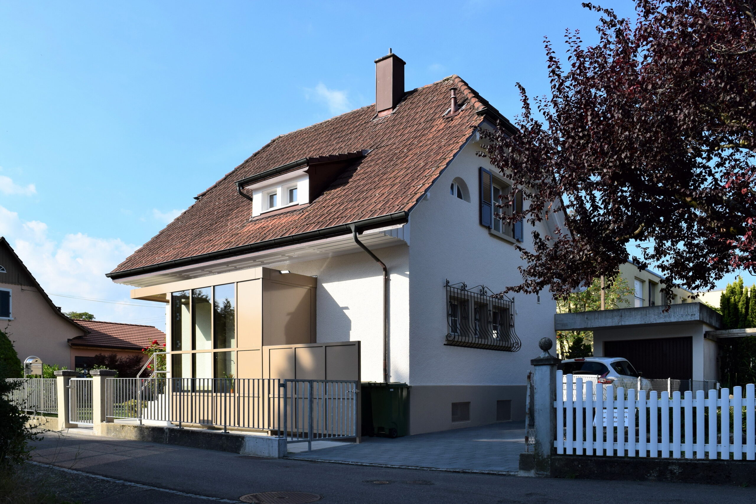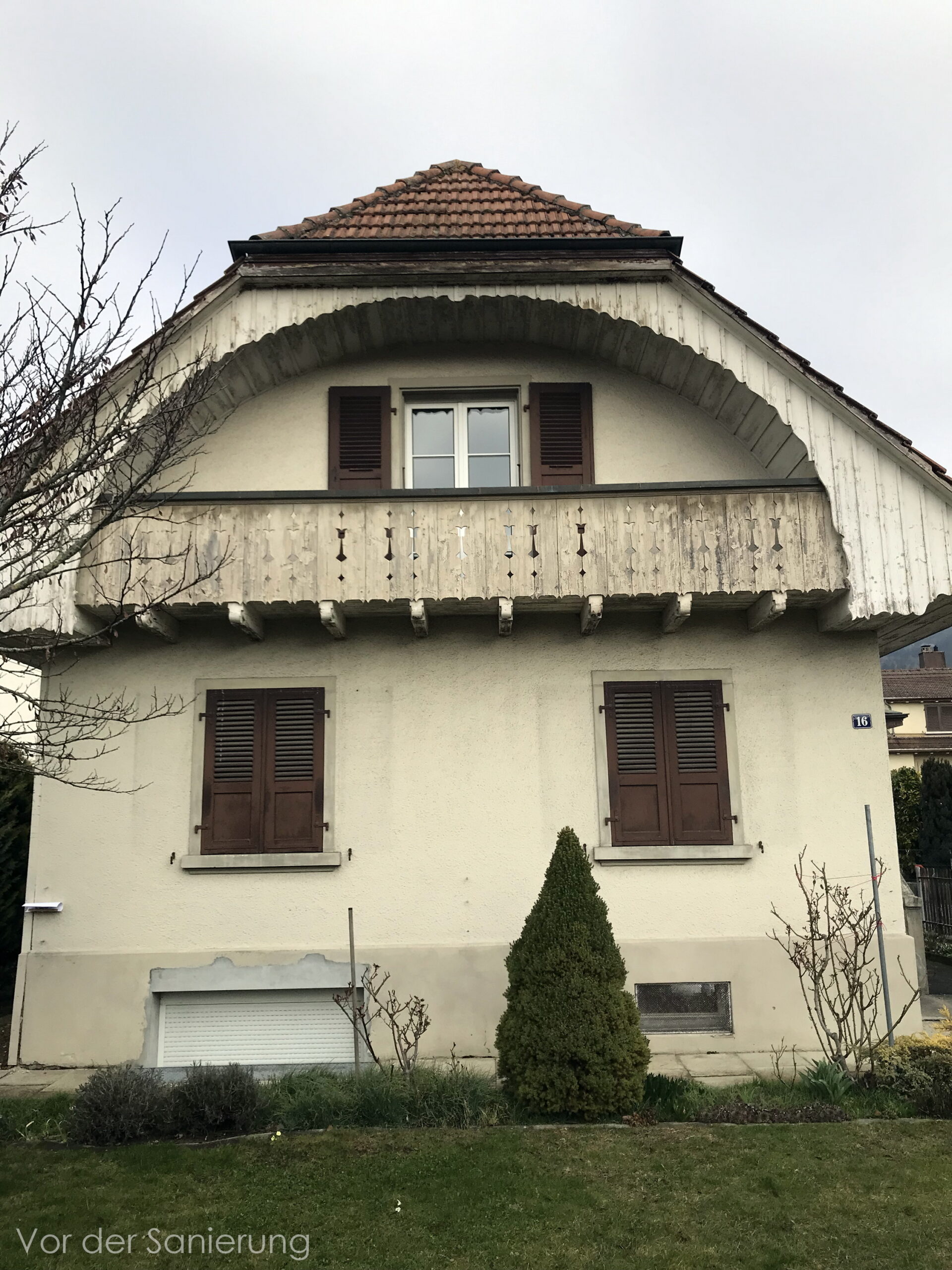 An der Westfassade wurde eine Fenstertür mit einer Aussentreppe ergänzt. Die Eternitfassade wurde entfernt und mit einem Kellenwurf wiederhergestellt. Das alte Blumenfenster ist in den ursprünglichen Zustand versetzt worden. Das Obergeschoss wurde energetisch saniert und die Oberflächen aufgefrischt. Die Küche im Erdgeschoss ist ersetzt worden. Die alten Fischgrätparkettböden geschliffen und geölt. Der Plattenbelag wurden im zeitgemässen Stil des Gebäudes ersetzt.