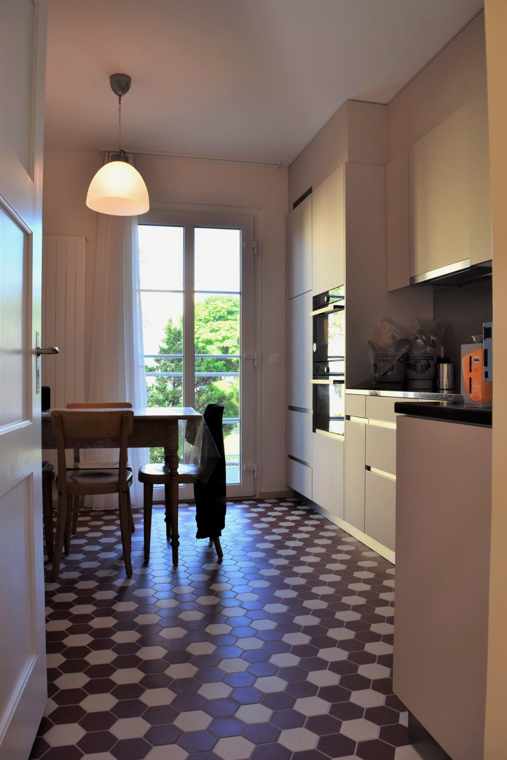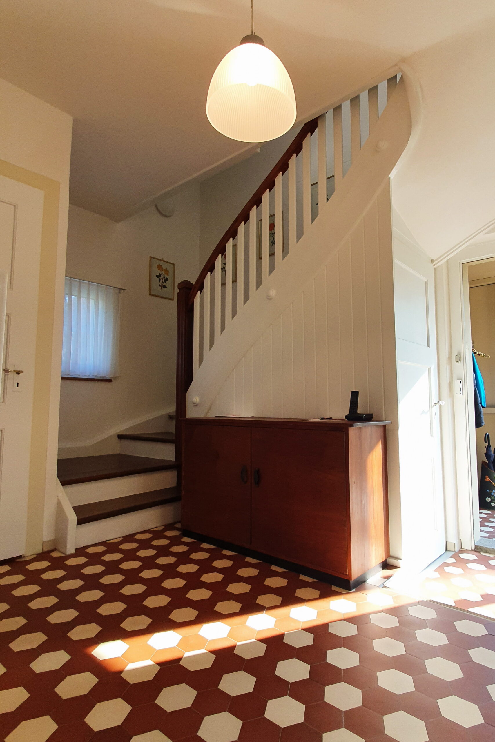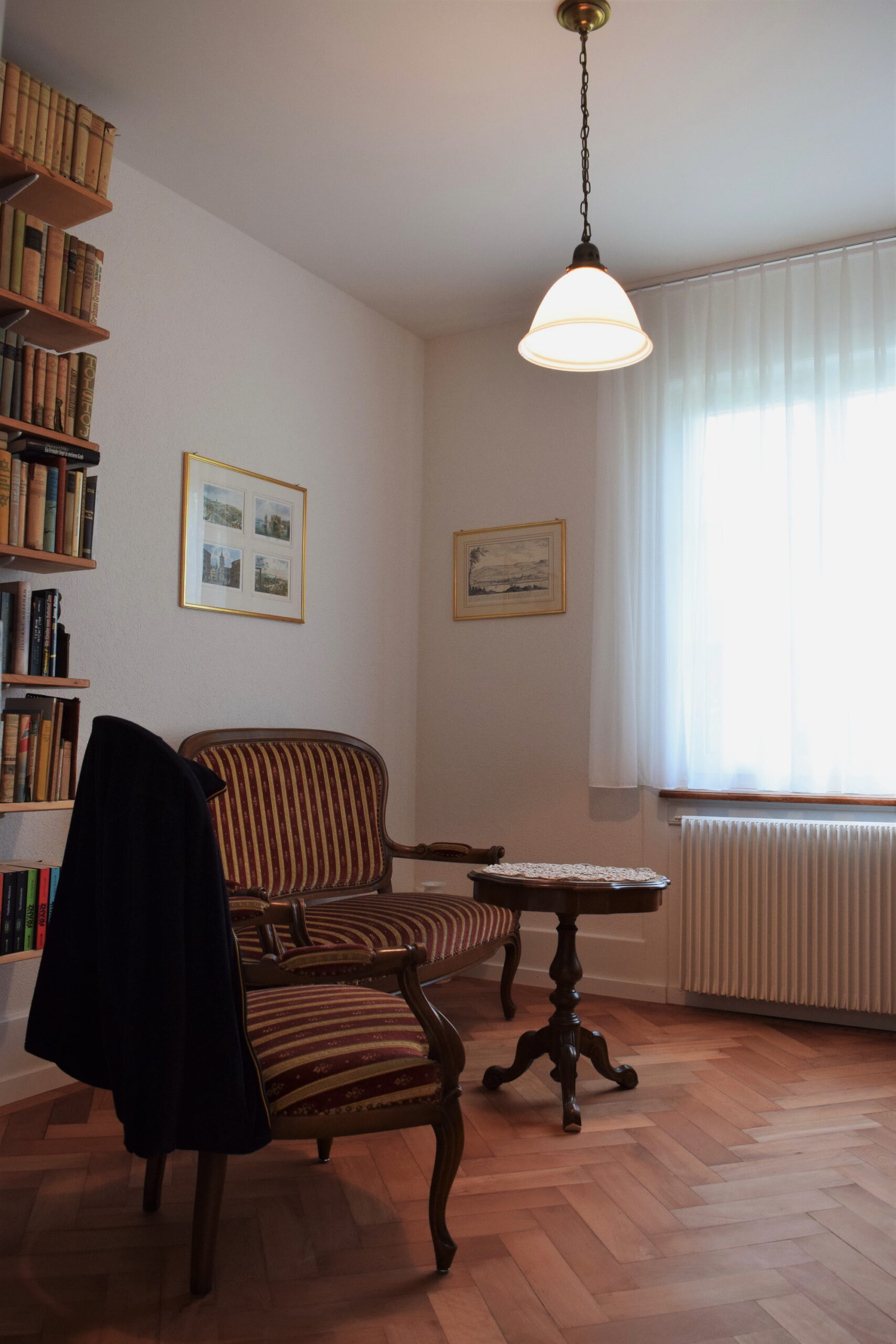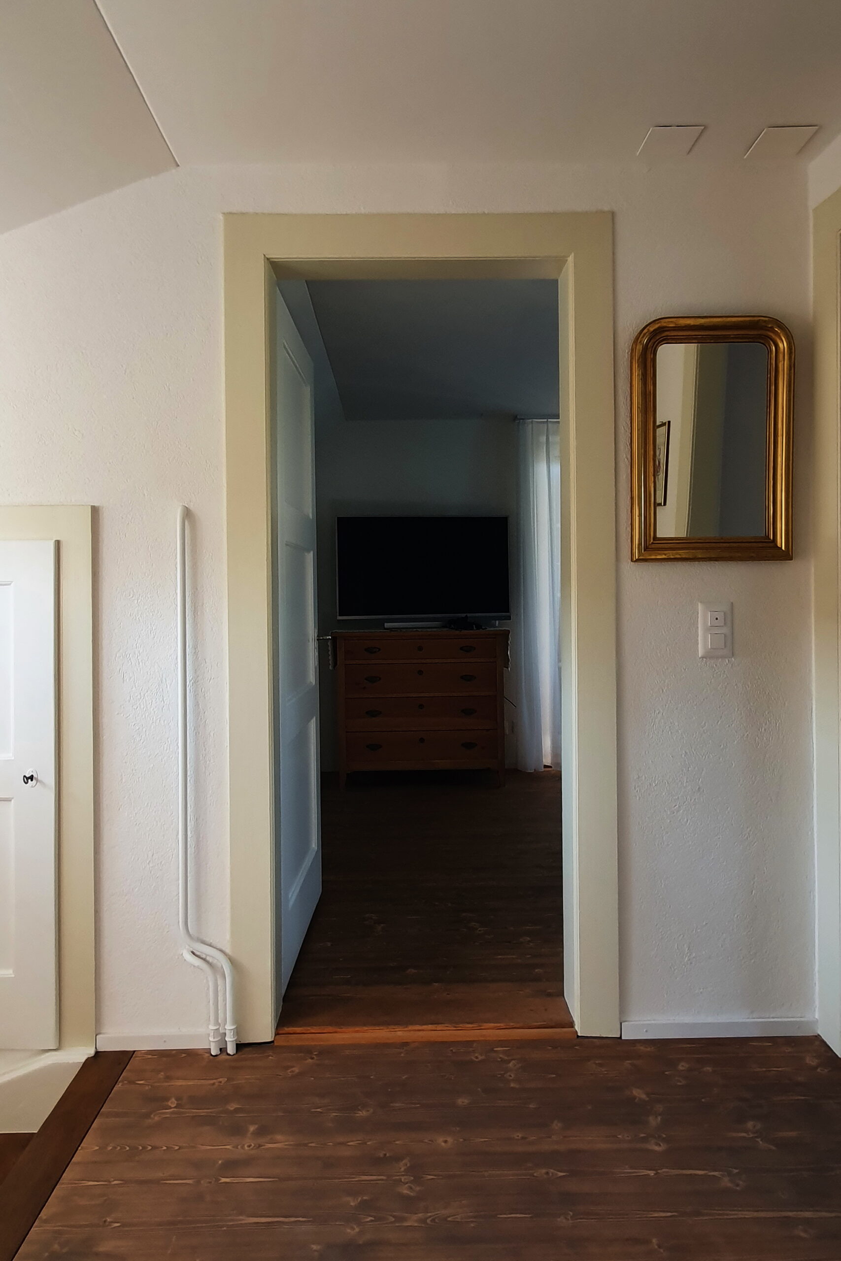 An der Westfassade wurde eine Fenstertür mit einer Aussentreppe ergänzt. Die Eternitfassade wurde entfernt und mit einem Kellenwurf wiederhergestellt. Das alte Blumenfenster ist in den ursprünglichen Zustand versetzt worden. Das Obergeschoss wurde energetisch saniert und die Oberflächen aufgefrischt. Die Küche im Erdgeschoss ist ersetzt worden. Die alten Fischgrätparkettböden geschliffen und geölt. Der Plattenbelag wurden im zeitgemässen Stil des Gebäudes ersetzt.