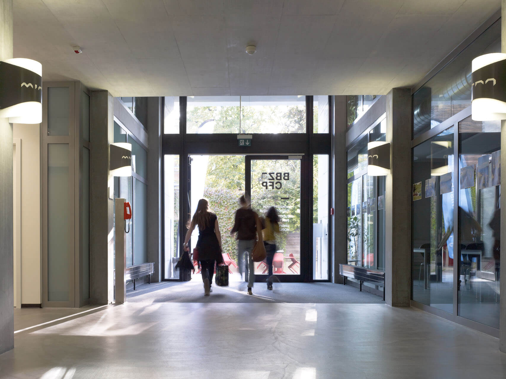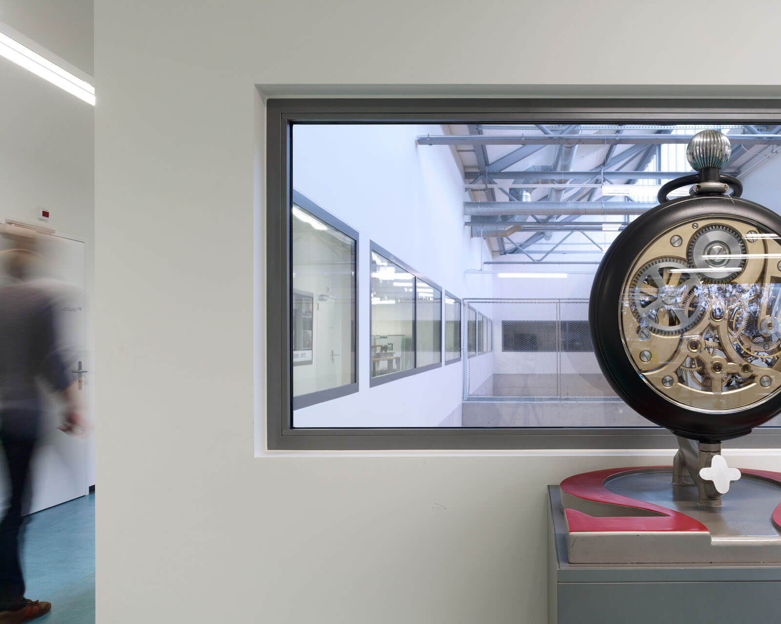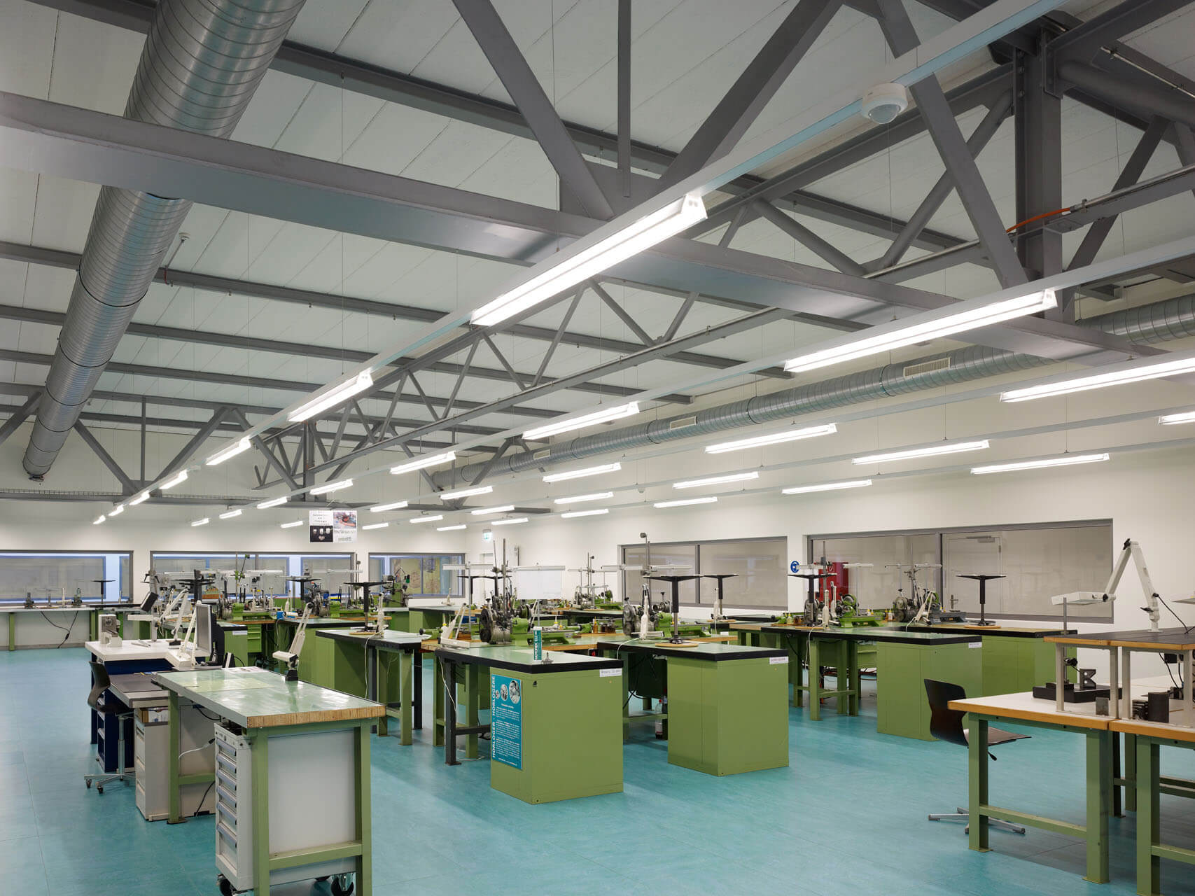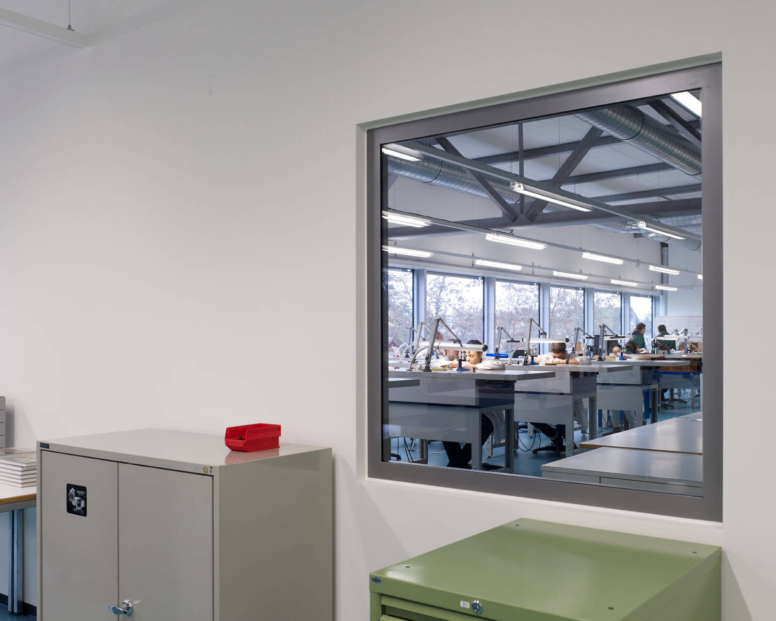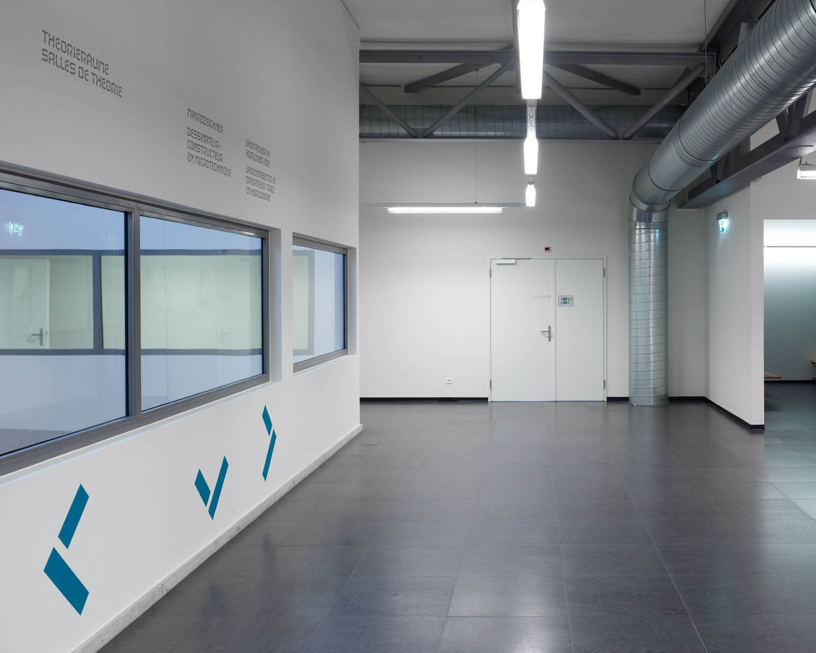 Der Charakter der alten Industriehalle wurde weitgehend übernommen. Der Boden im Obergeschoss wurde geöffnet, um das Licht der bestehenden Oblichter bis ins Erdgeschoss zu leiten. Die geschützte Fassade gegen die Salzhausstrasse wurde saniert, aber in ihrem Charakter belassen. Auf der Rückseite wurden grosszügige Verglasungen eingebaut um die Schulungsräume mit natürlichem Tageslicht zu versorgen. Einbau eines Zwischenbodens in Beton zur Vergrösserung der Fläche.